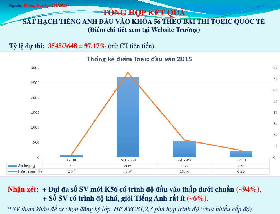 Vừa qua, Nhà trường đã tổ chức cho toàn bộ sinh viên K56 kiểm tra tiếng Anh đầu vào nhằm đánh giá trình độ, giúp các bạn sinh viên định hướng đăng ký các học phần tiếng Anh cho phù hợp, cũng như có kế hoạch tự bổ sung kiến thức nhằm đạt chuẩn đầu ra theo yêu cầu. Các bạn sinh viên lưu ý, hiện nay tỷ lệ tốt nghiệp đúng hạn là rất thấp, chủ yếu do nợ chuẩn đầu ra tiếng Anh. Vì vậy, các bạn cần tự lên kế hoạch học tập cho riêng mình nhằm đảm bảo đạt chuẩn càng sớm càng tốt. Từ khóa 54, Nhà trường áp dụng chuẩn chung là 450 điểm TOEIC quốc tế.