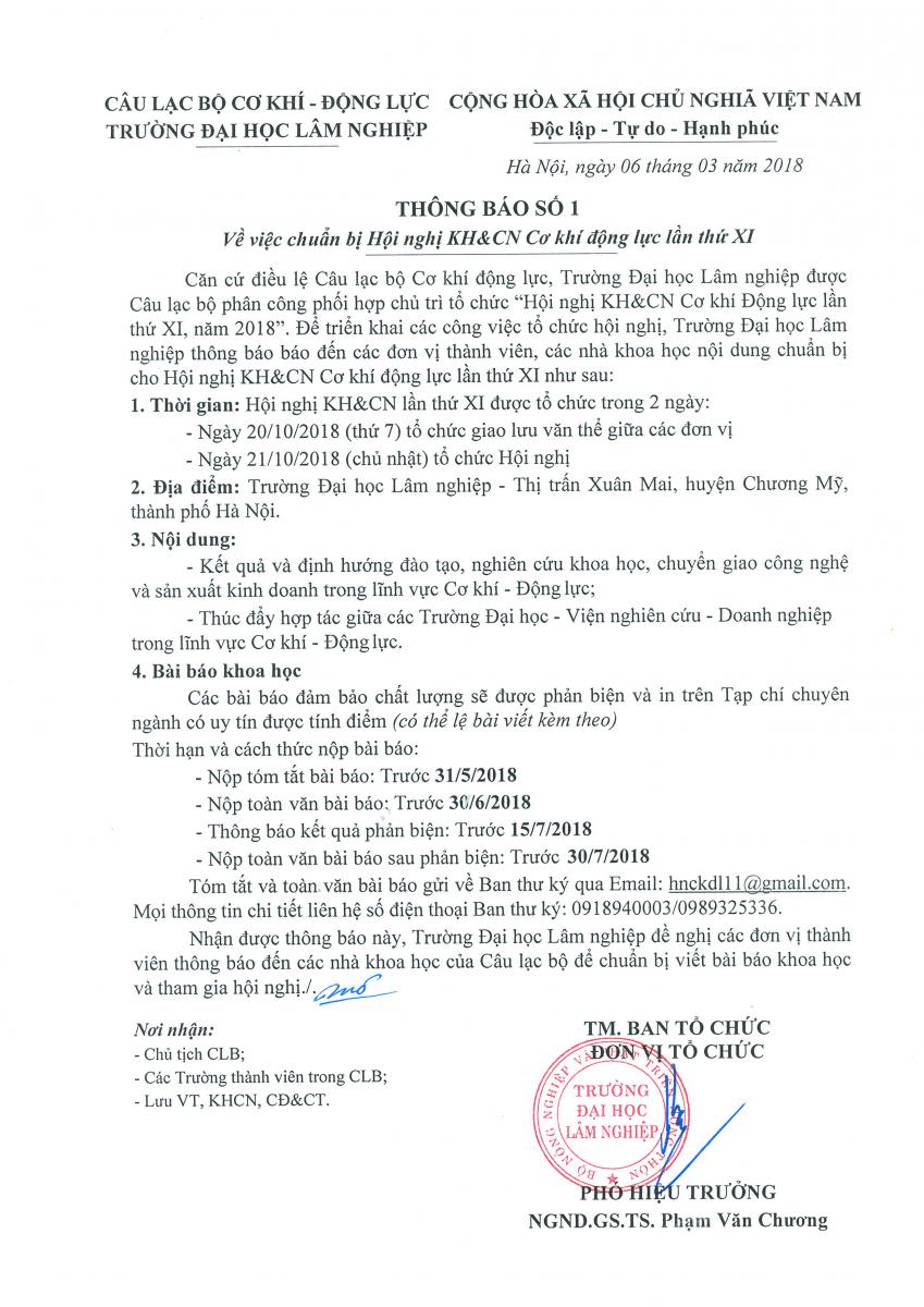 Thông báo số 1 Hội nghị KHCN CLB Cơ khí-Động lực lần thứ 11