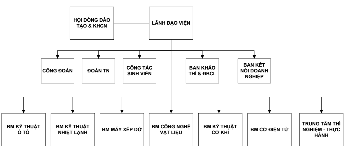Đề cao vai trò tự chủ để phù hợp với chiến lược tự chủ trong đào tạo đại học trên cả nước, Viện Cơ khí hướng tới xây dựng một cơ cấu tổ chức gọn nhẹ, năng động lấy tinh thần phục vụ làm nền tảng cho mọi hoạt động. Ngoài cơ cấu truyền thống, các ban chuyên môn và hệ thống trợ lý giúp cho mọi hoạt động của đơn vị được vận hành linh hoạt. Sơ đồ tổ chức của Viện như sau: